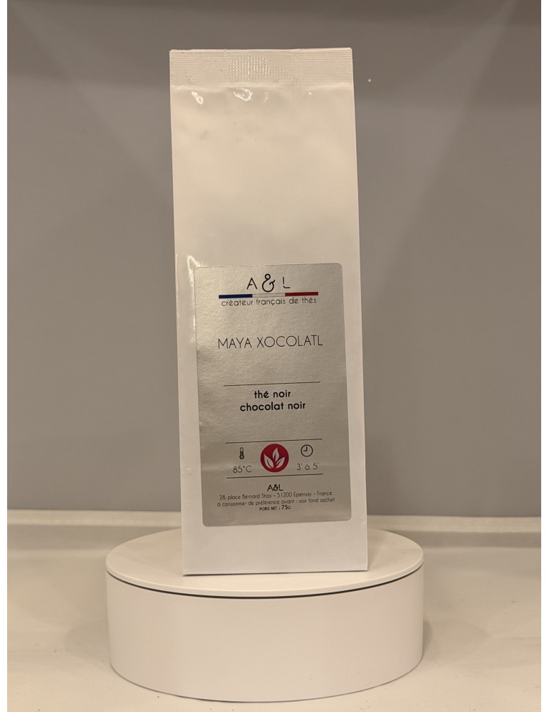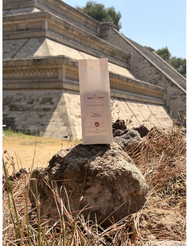 Maya Xocolatl est ce superbe thé noir savoureusement parfumé au chocolat noir agrémenté de brisures de cacao, de vanille, de pépites de chocolat et de flocons de noix de coco.