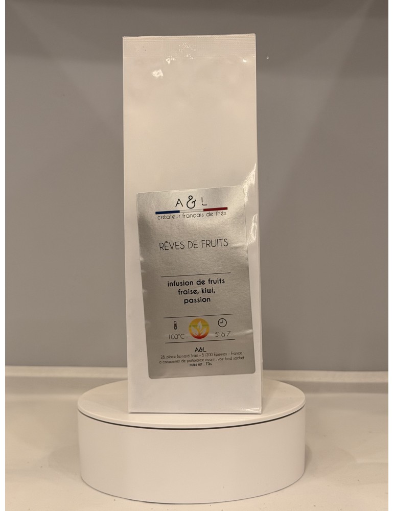 Véritable rêve éveillé ! Des fruits parfumés de fraise, kiwi et fruit de la passion auxquels s'ajoutent des morceaux de pomme, fraise, kiwi, fruit de la passion, framboise, écorces de cynorhodon, le tout parsemé de pétales de rose, bleuet, hibiscus et hélianthe. En touche final, du sureau noir venant purifier votre organisme !