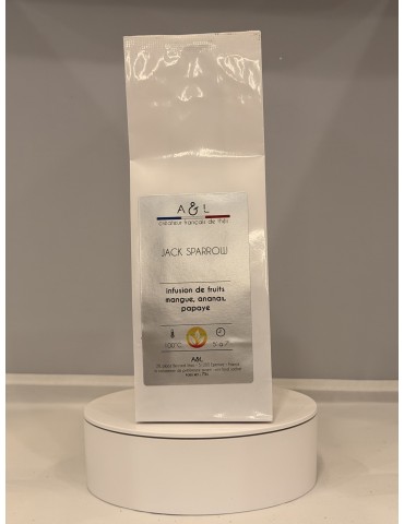 Infusion parfumée à la mangue et parsemée de morceaux d’ananas, de papaye, de groseille, de pétales d’hibiscus et de d’hélianthe.