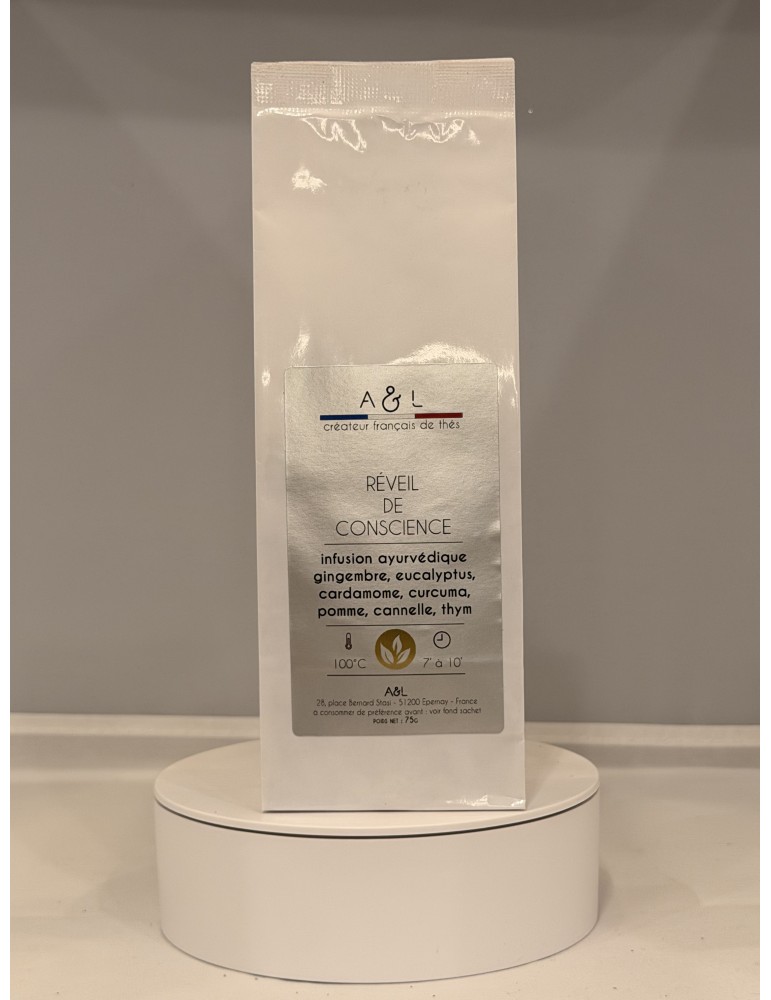 Gingembre, feuilles d'eucalyptus, cardamome, tranches de curcuma, zeste de citron, piment, cannelle, fleurs de sauge, morceaux de pomme, thym, fleurs de souci composent ce réveil de conscience.